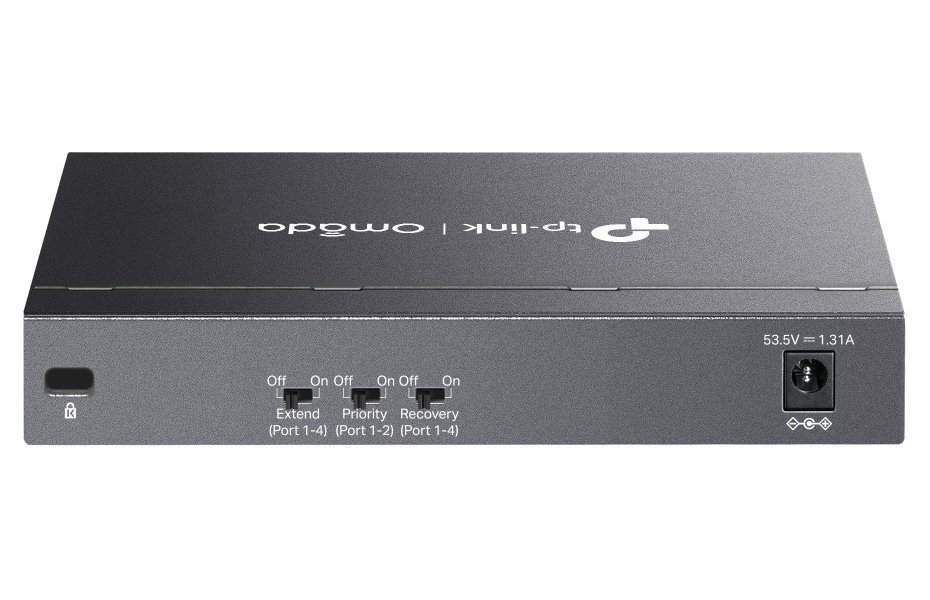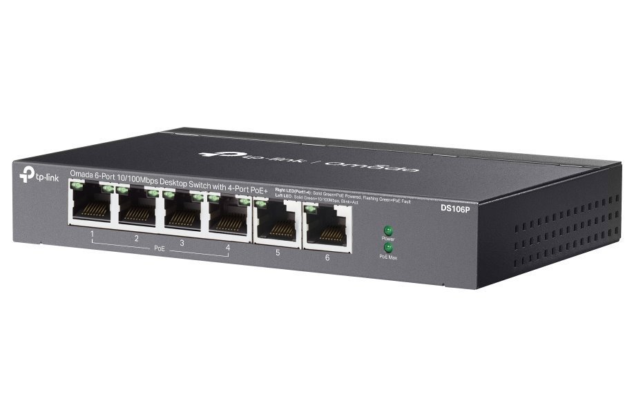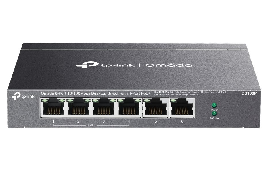 TP-Link DS106P 6portový switch s podporou PoE+ 802.3af/at. Plug and Play instalace, není nutná žádná konfigurace ani centrální správa. Součástí balení je napájecí adaptér. 6× 10/100 Mbps RJ-45 portů. 4× PoE+ porty přenášejí data a napájení na jediném kabelu. Podporuje výkon PoE až 30 W/port, celkový PoE budget činí 67 W. Režim Extend zvyšuje dosah přenosu dat a napájení až na 250 m. Režim priority zajišťuje vysokou prioritu portů 1–2 pro zaručení kvality citlivých aplikací. Funkce PoE Auto Recovery zaručuje stabilní provoz zařízení PoE automatickým restartem vypadlých nebo nereagujících zařízení PD. Design bez ventilátoru snižuje spotřebu energie. ZÁKLADNÍ SPECIFIKACE Porty: 6× RJ-45 10/100 Mb/s Kapacita switche: 1,2 Gbps Rychlost směrování: 0,8928 Mpps PoE: ano, 4× PoE+, 802.3af/at, celkem max. 67 W Napájení: DC 53,5 V/ 1,31 A, příkon do 75,4 W Rozměry: 158 × 101 × 25 mm