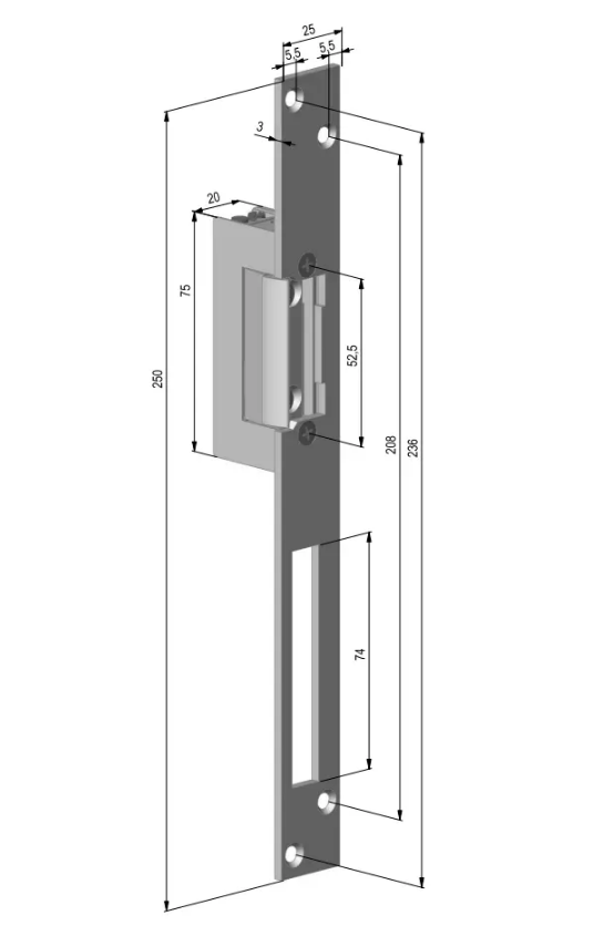 Je v poloze OTEVŘENO jen po dobu trvání napěťového impulzu – to je pouze po dobu, po kterou je stisknuto patřičné tlačítko na ovládacím zařízení (popřípadě sepnuté relé). Mimo tuto dobu jsou dveře UZAMČENY. Nastavitelná západka. Napájení: 24VDC (115mA)