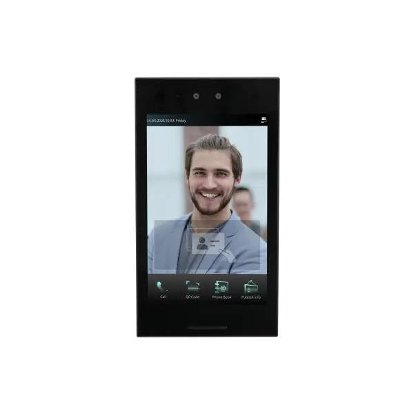 Dveřní stanice s dotykovým displejem. Barevná 2 Mpx dual lens kamera, mikrofon a reproduktor, venkovní provedení IP65, čtečka RFID karet (13,56 MHz).